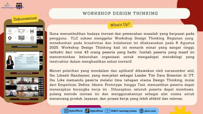 Guna menumbuhkan budaya inovasi dan pemecahan masalah yang berpusat pada pengguna , YLC menggelar Workshop Design Thinking. Kegiatan ini dilaksanakan pada 6 Agustus 2025. Workshop Design Thinking kali ini menarik minat yang sangat tinggi, terbukti dari total 43 orang peserta yang hadir. Jumlah peserta yang masif ini mencerminkan kebutuhan organisasi untuk mengadopsi metodologi yang terstruktur dalam menghasilkan solusi inovatif.