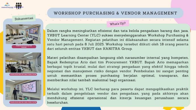 Dalam rangka meningkatkan efisiensi dan tata kelola pengadaan barang dan jasa, YKBUT Learning Center (YLC) sukses menyelenggarakan Workshop Purchasing & Vendor Management. Kegiatan pelatihan ini dilaksanakan secara intensif selama satu hari penuh pada 8 Juli 2025. Workshop tersebut diikuti oleh 18 orang peserta dari seluruh entitas YKBUT dan KANITRA Group.